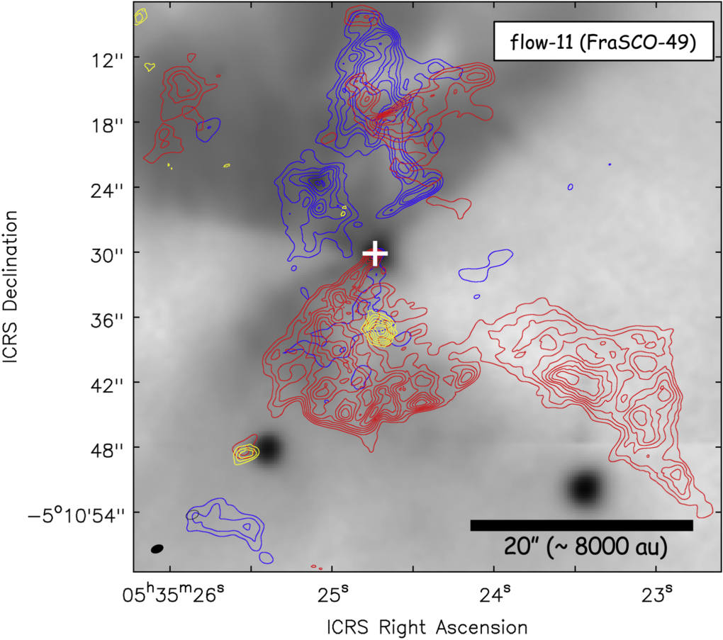 Figure 3: HOPS 368. Gray background shows the 2.2 μKs band image obtained from SIRIUS/IRSF (Takahashi et al. 2008). The white cross denotes the position of the outflow driving source (FraSCO-49). The red contours represent the integrated intensity of the redshifted CO components obtained from the ALMA 12 m array. The blue contours represent the integrated intensity of the blueshifted CO components obtained from the ALMA 12 m array. The yellow contours represent the integrated intensity of the blueshifted SiO component obtained from the ALMA 12 m array.